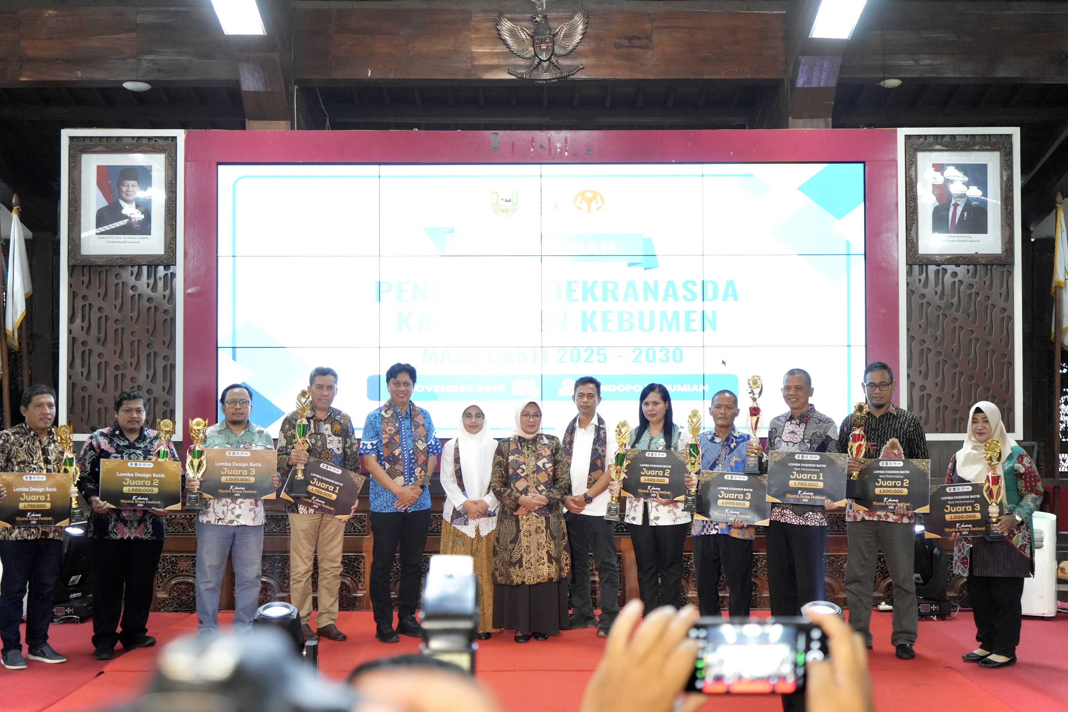 KEBUMEN – Dewan Kerajinan Nasional Daerah (Dekranasda) Kabupaten Kebumen Masa Bakti 2025-2030 resmi dikukuhkan di Pendopo Kabumian, Sabtu 8 November 2025. Pengukuhan ini bersamaan dengan puncak acara Kebumen Wastra dan Kriya Festival 2025, sekaligus pengumuman pemenang lomba.