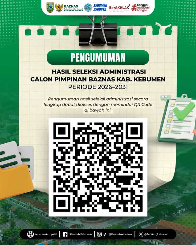 Pengumuman tersebut tertuang dalam surat bernomor 400.8/0181 yang ditandatangani Sekretaris Daerah Kabupaten Kebumen selaku Ketua Panitia Seleksi Calon Pimpinan Baznas Kebumen periode 2026–2031, tertanggal 3 Februari 2026. Dalam pengumuman itu dijelaskan bahwa peserta yang lolos seleksi administrasi akan mengikuti Seleksi Kompetensi Pengetahuan Dasar dengan metode Computer Assisted Test (CAT).