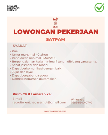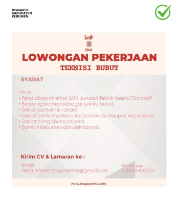 Kebumen – PT Nagasemut Indonesia saat ini membuka kesempatan berkarir bagi putra-putri terbaik untuk mengisi beberapa posisi penting di perusahaan. Lowongan kerja ini ditujukan bagi mereka yang memiliki keahlian, integritas, serta keseriusan untuk berkembang bersama perusahaan.