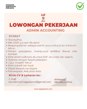 - Berpengalaman sebagai admin accounting & tax minimal 1 tahun