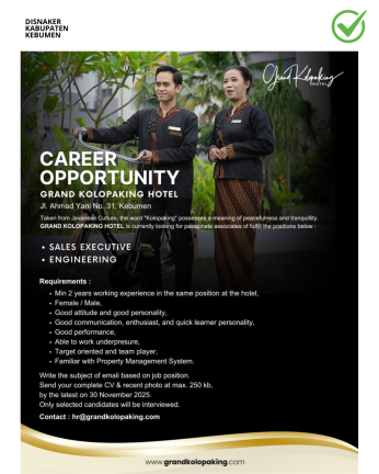 Bagi Anda yang memiliki semangat kerja tinggi dan ingin berkembang dalam industri perhotelan, inilah kesempatan untuk menjadi bagian dari Grand Kolopaking Hotel Kebumen – tempat di mana profesionalisme dan keramahan menjadi nilai utama.