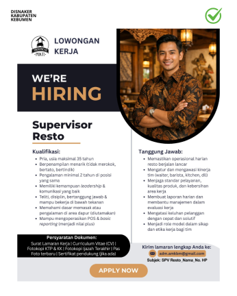 KEBUMEN – Kesempatan berkarier di bidang kuliner kembali terbuka. Sebuah perusahaan restoran melalui akun rekrutmen resminya membuka lowongan kerja untuk posisi Supervisor Resto bagi kandidat yang memenuhi kualifikasi.